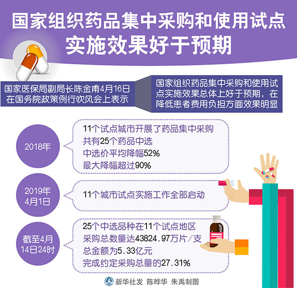 圖表:國(guó)家組織藥品集中采購(gòu)和使用試點(diǎn)實(shí)施效果好于預(yù)期 新華社發(fā) 陳曄華 朱禹 制圖