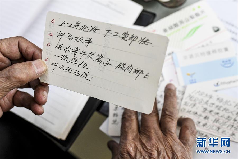 90歲的第一代老軍墾陸振歐老人在家中整理自己利用廢舊藥盒制作的“石河子老故事”卡片(4月10日攝)。新華社記者 王菲 攝