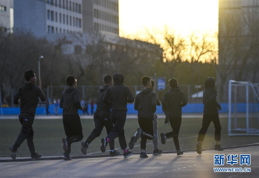 在新疆石河子大學(xué)一處操場(chǎng)上晨練的學(xué)生(4月10日攝)。新華社記者 王菲 攝