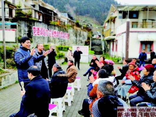 3月5日,作為漁子溪村第一書記的鄒凌(左一揮手者)正在給村民開動(dòng)員大會(huì)。記者江毅攝
