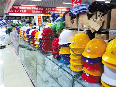 朝陽(yáng)某大型建材市場(chǎng)內(nèi)有各價(jià)位的安全帽出售,商家稱(chēng)10余元的需求大。新京報(bào)記者 張熙廷 攝