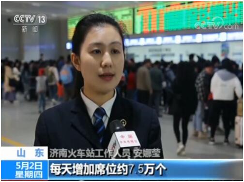 濟(jì)南火車站工作人員 安娜瑩:我們增開列車216趟,320趟動(dòng)車組列車由八節(jié)車廂改為十六節(jié)車廂重聯(lián)運(yùn)行,每天增加席位約7.5萬個(gè)。