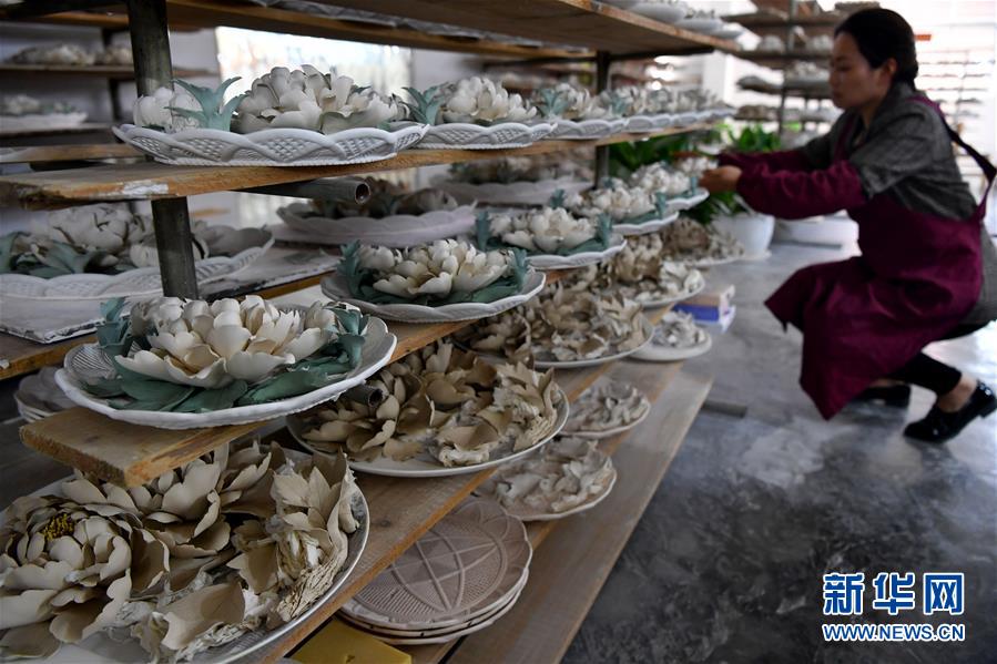 洛陽牡丹瓷股份有限公司的員工將半成品放置在架子上(4月25日攝)。新華社記者 李嘉南 攝