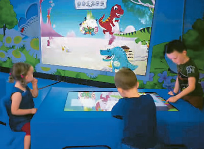 陸浩川團(tuán)隊(duì)的人機(jī)交互產(chǎn)品如今已銷往全球20多個國家。圖為兒童正在交互屏幕前玩得不亦樂乎。(受訪者供圖)