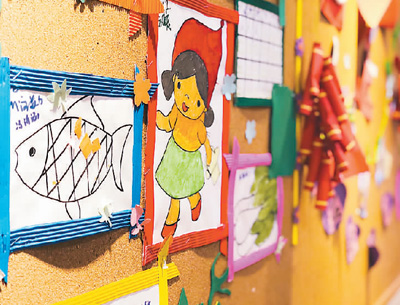 在北京五彩鹿高碑店校區(qū)的走廊墻壁上,張貼著自閉癥譜系障礙兒童的繪畫作品。畫筆下藏著孩子心中五彩斑斕的世界。記者 孫亞慧攝
