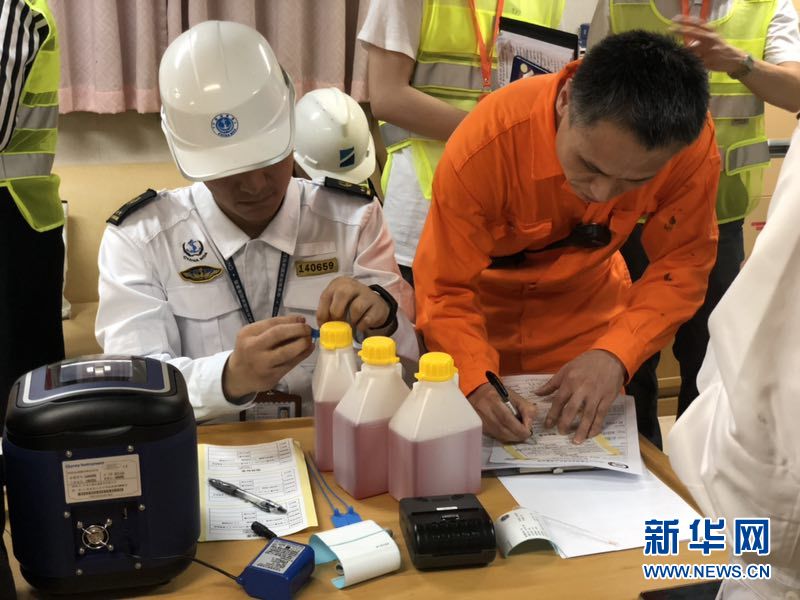 6月1日,深圳海事局執(zhí)法人員正使用快速燃油檢驗(yàn)儀檢測(cè)燃油。