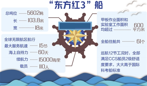 “東方紅3”船是一艘5000噸級新型深遠(yuǎn)海綜合科學(xué)考察船,以培養(yǎng)深海大洋創(chuàng)新型人才為首要任務(wù),融合科學(xué)研究、科學(xué)考察、高新技術(shù)研發(fā)應(yīng)用為一體。該船總長103.8米、寬18米,海上自持力長達60天,可連續(xù)航行1.5萬海里;載員110人,甲板作業(yè)面積和實驗室工作面積均超過600平方米。該船是目前世界上最安靜,定員最多,經(jīng)濟性、振動噪聲、電磁兼容等指標(biāo)要求最高,作業(yè)甲板和實驗室面積利用率最大、綜合科考功能最完備的新一代海洋綜合科考船。