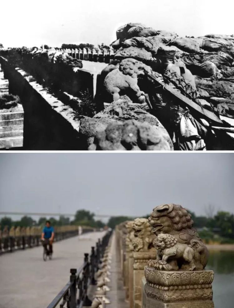 上圖為守衛(wèi)盧溝橋的29軍士兵抵抗日本侵略軍入侵(資料照片);下圖為2017年7月3日拍攝的盧溝橋(新華社記者 張晨霖 攝)。