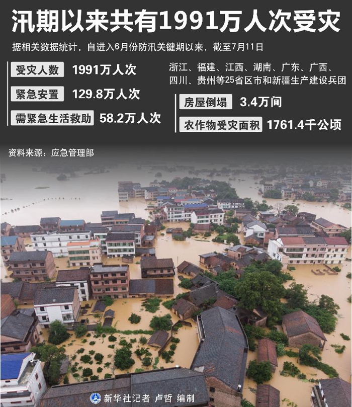 新華社北京7月11日電(記者葉昊鳴)記者11日從應(yīng)急管理部獲悉,自進(jìn)入6月份防汛關(guān)鍵期以來(lái),截至7月11日,共有1991萬(wàn)人次受災(zāi),129.8萬(wàn)人次緊急安置,58.2萬(wàn)人次需緊急生活救助。