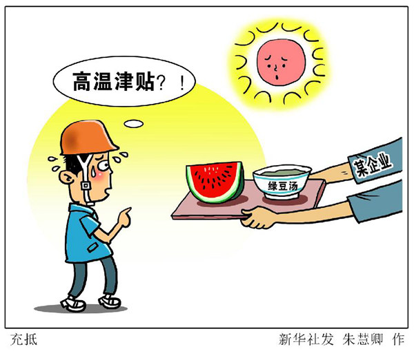 此外,記者采訪發(fā)現(xiàn),一些用人單位為減少高溫津貼的發(fā)放,手段花樣繁多:有的把高溫津貼計(jì)算在最低工資標(biāo)準(zhǔn)內(nèi),或者把本該平時(shí)發(fā)放的獎(jiǎng)金,一部分計(jì)為高溫津貼;有的通過發(fā)放防暑降溫物品替代高溫津貼,用西瓜、綠豆湯打發(fā)了事。有工人算了這樣一筆賬:“西瓜2元一斤,綠豆湯3元一碗,一個(gè)月下來也只有幾十元的成本,比發(fā)兩三百元的高溫津貼省多了?!?/p>