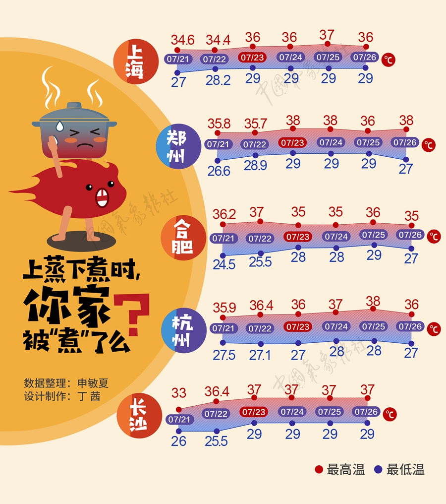 其中,鄭州、合肥、南京、上海、長(zhǎng)沙、南昌等地不僅最高氣溫超過(guò)35℃,持續(xù)5天至7天,而且最低氣溫也在28℃、29℃,夜間炎熱絲毫沒(méi)有緩和,可謂火力十足。