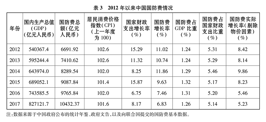2012年至2017年,中國(guó)國(guó)防費(fèi)從6691.92億元人民幣增加到10432.37億元人民幣。中國(guó)國(guó)內(nèi)生產(chǎn)總值(GDP)按當(dāng)年價(jià)格計(jì)算年平均增長(zhǎng)9.04%,國(guó)家財(cái)政支出年平均增長(zhǎng)10.43%,國(guó)防費(fèi)年平均增長(zhǎng)9.42%,國(guó)防費(fèi)占國(guó)內(nèi)生產(chǎn)總值平均比重為1.28%,占國(guó)家財(cái)政支出平均比重為5.26%。國(guó)防費(fèi)占國(guó)內(nèi)生產(chǎn)總值的比重穩(wěn)定,與國(guó)家財(cái)政支出保持同步協(xié)調(diào)增長(zhǎng)。