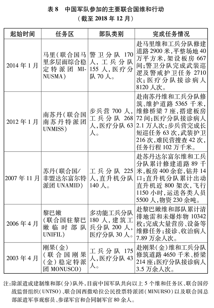 中國(guó)積極支持聯(lián)合國(guó)維和行動(dòng),是聯(lián)合國(guó)維和行動(dòng)的主要出資國(guó)之一,是安理會(huì)常任理事國(guó)中第一大出兵國(guó)。截至2018年12月,中國(guó)軍隊(duì)已累計(jì)參加24項(xiàng)聯(lián)合國(guó)維和行動(dòng),派出維和軍事人員3.9萬余人次,13名中國(guó)軍人犧牲在維和一線。中國(guó)軍隊(duì)在維和任務(wù)區(qū)新建、修復(fù)道路1.3萬余千米,排除地雷及各類未爆物10342枚;運(yùn)送物資135萬余噸,運(yùn)輸總里程1300萬余千米;接診病人17萬余人次;完成武裝護(hù)衛(wèi)、長(zhǎng)短途巡邏等任務(wù)300余次。