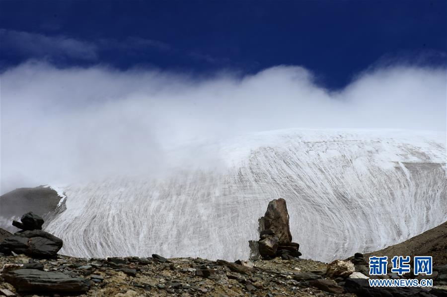 這是在青海省海西蒙古族藏族自治州格爾木市境內(nèi)拍攝的昆侖山玉珠峰冰川一角(2017年8月19日攝)。新華社記者 張宏祥 攝