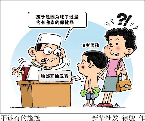 “起初是孩子不愿意去上游泳課了,也不說原因。直到有一次出去吃飯時,孩子把湯倒在了身上,卻死活不讓我脫上衣,才發(fā)現孩子的乳房竟然發(fā)育了。”浩浩媽媽李女士告訴記者,經兒科醫(yī)生診斷,是因為吃了不少補鋅的保健品導致激素紊亂,生長加速。