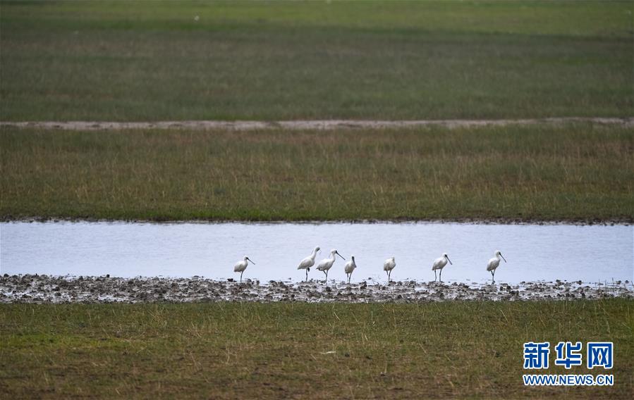 在位于江蘇鹽城東部沿海的大豐麋鹿國(guó)家級(jí)自然保護(hù)區(qū),一群黑臉琵鷺在水邊棲息(6月27日攝)。新華社記者 李響 攝
