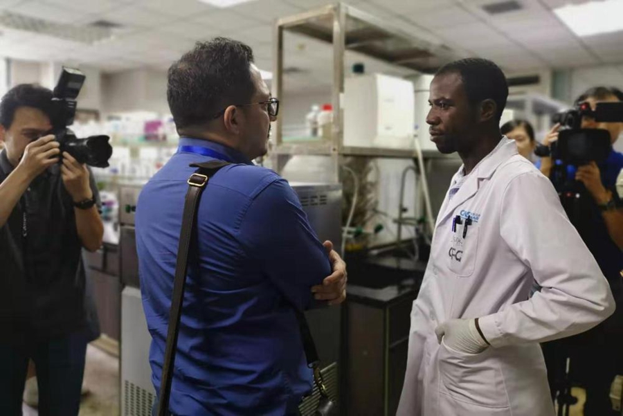 來自喀麥隆的阿諾德(右一)在病原微生物與免疫學(xué)重點(diǎn)實驗室從事博士后研究,他在向外國媒體記者介紹自己的工作。(王曉亮攝)
