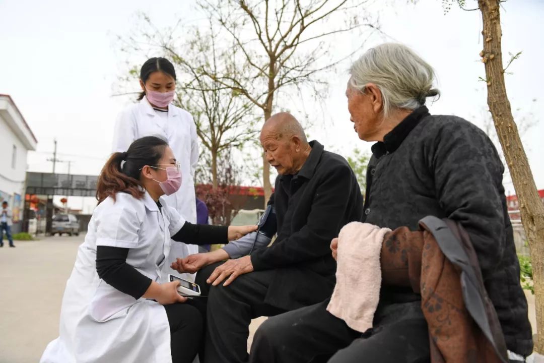 醫(yī)護(hù)人員在巨鹿縣南大韓村菘樂敬老院為老人測(cè)量血壓 牟宇 攝