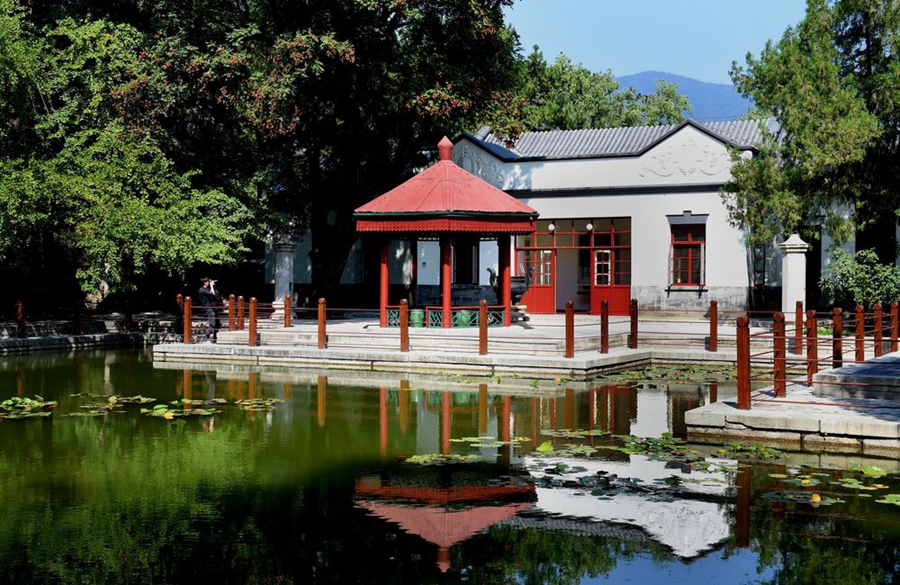 雙清別墅里,簡樸的桌椅家具,墻上的地圖,桌上的紙筆書報,還原著革命勝利前夜,開國領(lǐng)袖在此運(yùn)籌帷幄、決勝千里的場景;六角紅亭前,當(dāng)年毛主席坐在木椅上閱讀《進(jìn)步日報》“南京解放”報道的畫面,如在眼前。