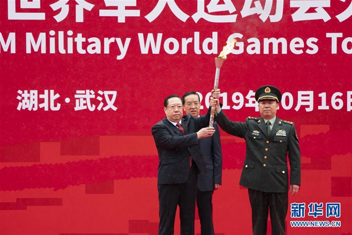 10月16日,第七屆世界軍人運(yùn)動(dòng)會(huì)組委會(huì)副主席黎火輝(前右)將點(diǎn)火棒交給湖北省人民政府省長(zhǎng)王曉東(前左)。當(dāng)日,第七屆世界軍人運(yùn)動(dòng)會(huì)火炬?zhèn)鬟f活動(dòng)在武漢東湖綠道舉行。新華社記者 熊琦 攝