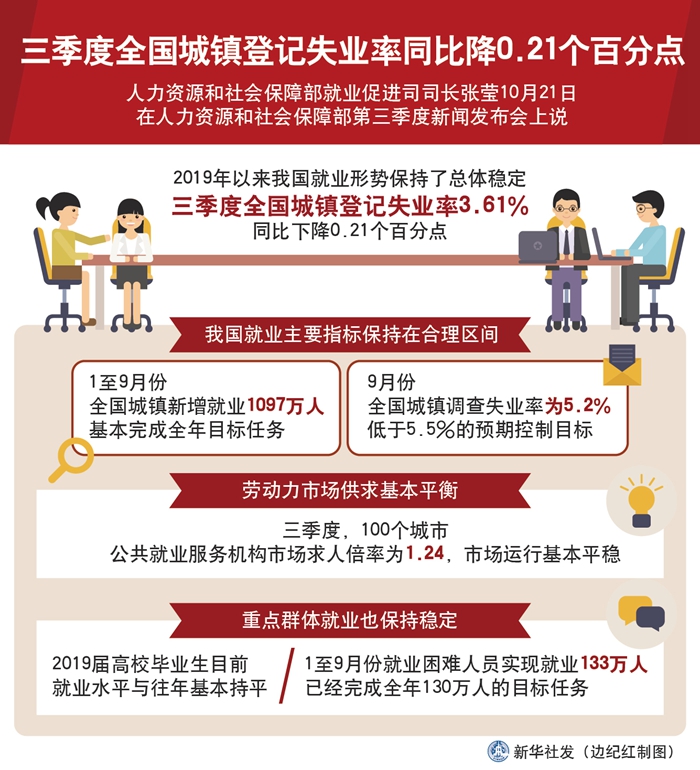 新華社北京10月21日電(記者王優(yōu)玲)人力資源和社會(huì)保障部就業(yè)促進(jìn)司司長(zhǎng)張瑩21日說(shuō),今年以來(lái)我國(guó)就業(yè)形勢(shì)保持了總體穩(wěn)定,三季度全國(guó)城鎮(zhèn)登記失業(yè)率3.61%,同比下降0.21個(gè)百分點(diǎn)。