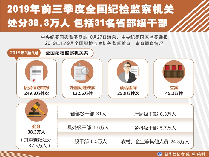 新華社北京10月27日電(記者朱基釵)中央紀(jì)委國家監(jiān)委網(wǎng)站27日消息,中央紀(jì)委國家監(jiān)委通報2019年1至9月全國紀(jì)檢監(jiān)察機關(guān)監(jiān)督檢查、審查調(diào)查情況。2019年1至9月,全國紀(jì)檢監(jiān)察機關(guān)共接受信訪舉報249.3萬件次,立案45.2萬件,處分38.3萬人,包括省部級干部31人,廳局級干部0.3萬人。