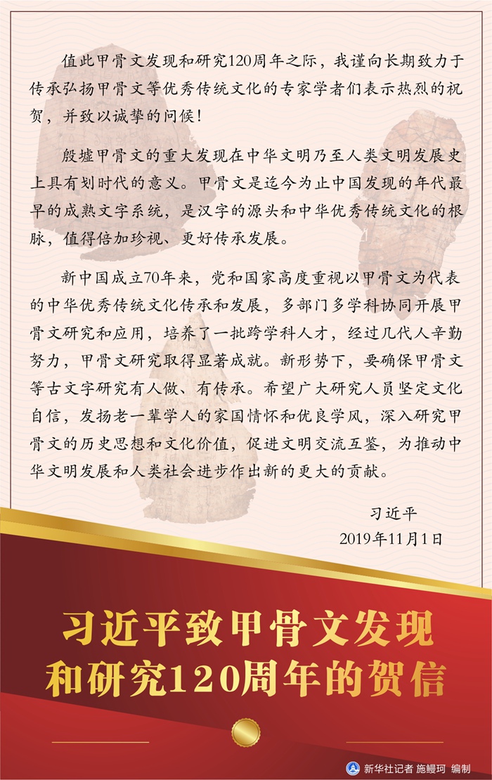 習近平致甲骨文發(fā)現和研究120周年的賀信 新華社記者 施鰻珂 編制