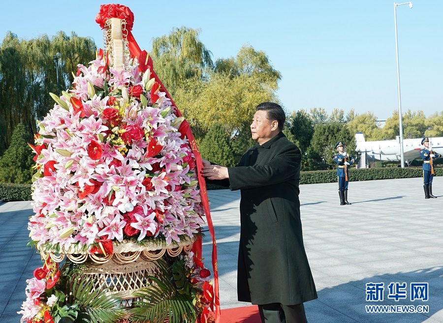 11月8日,中共中央總書記、國家主席、中央軍委主席習近平出席慶??哲姵闪?0周年主題活動,代表黨中央和中央軍委,對空軍成立70周年表示熱烈祝賀,向空軍全體官兵致以誠摯問候。這是習近平來到位于北京市昌平區(qū)的中國航空博物館,向人民空軍英烈敬獻花籃。 新華社記者 李剛 攝