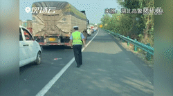 在湖北,一名交警停車拾起掉落在高速公路上的國(guó)旗。