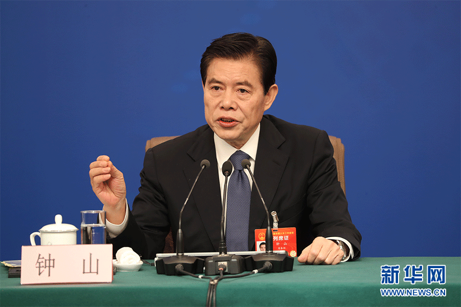 十三屆全國(guó)人大二次會(huì)議新聞中心3月9日(星期六)10時(shí)30分在梅地亞中心新聞發(fā)布廳舉行記者會(huì),邀請(qǐng)商務(wù)部部長(zhǎng)鐘山、副部長(zhǎng)兼國(guó)際貿(mào)易談判副代表王受文、副部長(zhǎng)錢(qián)克明就“促進(jìn)形成強(qiáng)大國(guó)內(nèi)市場(chǎng) 推動(dòng)全方位對(duì)外開(kāi)放”相關(guān)問(wèn)題回答中外記者提問(wèn)。圖為商務(wù)部部長(zhǎng)鐘山。新華網(wǎng)/中國(guó)政府網(wǎng) 陳杰 攝