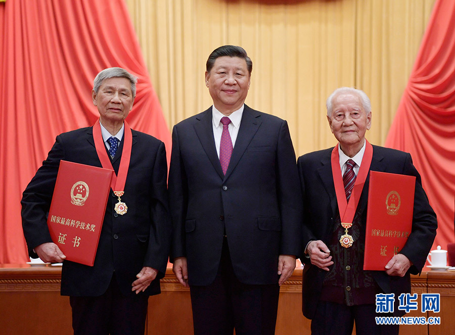 1月10日,2019年度國家科學(xué)技術(shù)獎(jiǎng)勵(lì)大會(huì)在北京人民大會(huì)堂隆重舉行。中共中央總書記、國家主席、中央軍委主席習(xí)近平向獲得2019年度國家最高科學(xué)技術(shù)獎(jiǎng)的原中國船舶重工集團(tuán)公司第七一九研究所黃旭華院士(右)和中國科學(xué)院大氣物理研究所曾慶存院士(左)頒獎(jiǎng)。 新華社記者 李學(xué)仁 攝