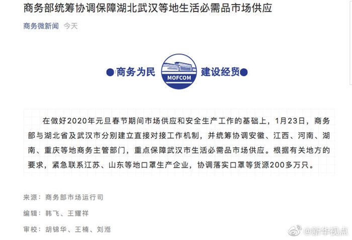記者從商務(wù)部了解到,23日,商務(wù)部統(tǒng)籌協(xié)調(diào)安徽、江西、河南、湖南、重慶等地商務(wù)主管部門,重點保障武漢市生活必需品市場供應(yīng)。根據(jù)有關(guān)地方的要求,緊急聯(lián)系江蘇、山東等地口罩生產(chǎn)企業(yè),協(xié)調(diào)落實口罩等貨源200多萬只。(記者王雨蕭、陳煒偉)?