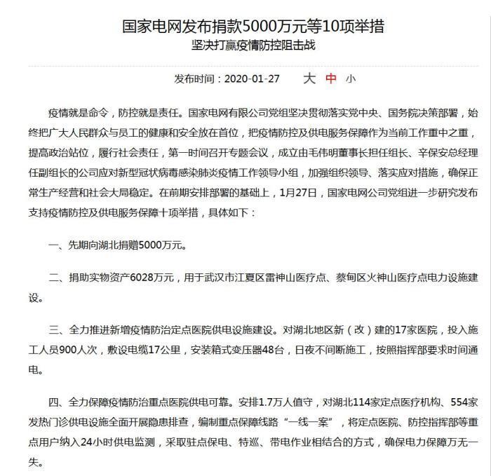 在前期安排部署的基礎上,1月27日,國家電網公司黨組進一步研究發(fā)布支持疫情防控及供電服務保障十項舉措,具體如下: