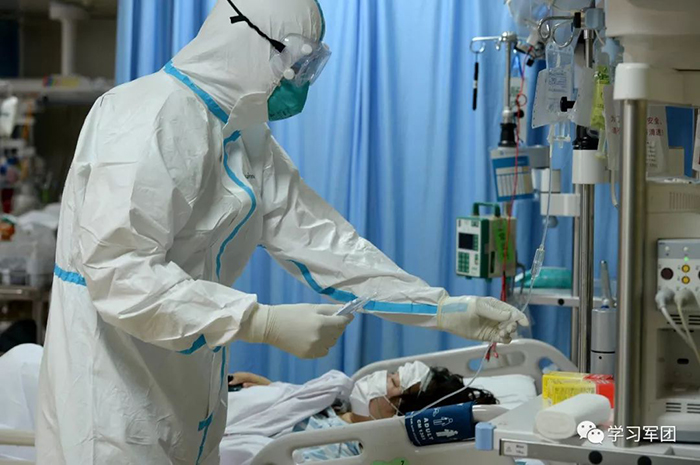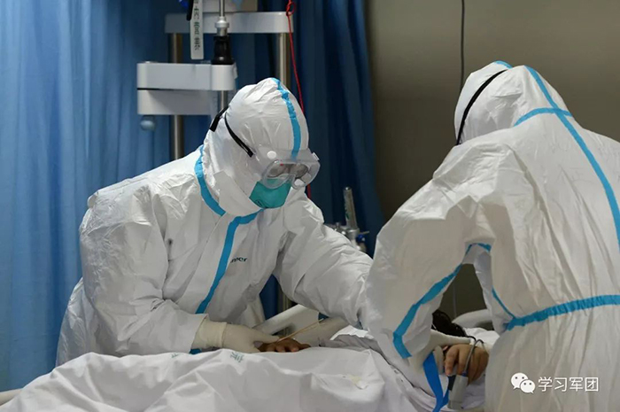 1月27日上午,海軍軍醫(yī)大學(xué)醫(yī)療隊(duì)醫(yī)護(hù)人員在漢口醫(yī)院重癥監(jiān)護(hù)室對(duì)新型冠狀病毒感染的肺炎患者進(jìn)行救治。醫(yī)護(hù)人員對(duì)患者進(jìn)行輸液護(hù)理。解放軍報(bào)記者范顯海攝