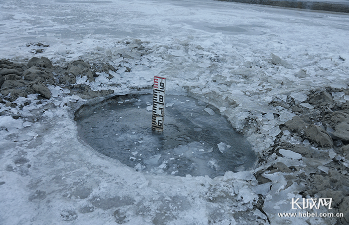 冬季的河水冰冷刺骨,賈海穿著救生衣和膠褲,戴上迷彩棉手套、火車頭帽子,拿著2米長的探測(cè)桿邁入了冰冷的河水里進(jìn)行冰期測(cè)流,這一站就要半個(gè)小時(shí)?!跋募緯r(shí)可以用自動(dòng)化儀器鉛魚來施測(cè),冬季河面封凍結(jié)冰后儀器下不到水里,就只能人工施測(cè)。”賈海說。