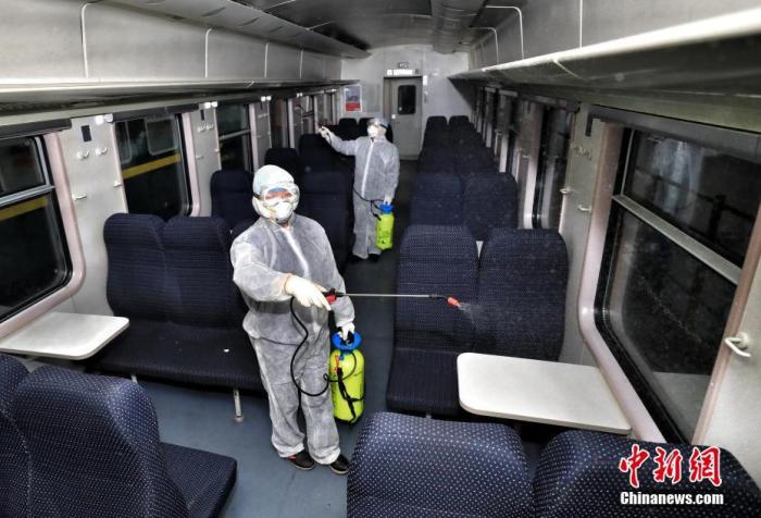 2月2日,中國鐵路烏魯木齊局集團(tuán)有限公司疾控中心消殺科站車消殺隊(duì)對車體內(nèi)對坐席噴灑消毒液。中新社發(fā) 擺風(fēng)亮 攝