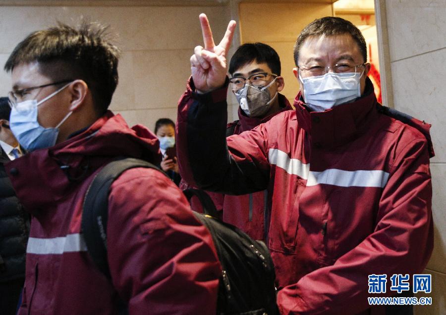 2月1日,中日友好醫(yī)院黨委書(shū)記周軍(右一)在出發(fā)前做出勝利的手勢(shì)。當(dāng)日,為進(jìn)一步加強(qiáng)武漢新型冠狀病毒感染的肺炎危重癥患者救治工作,國(guó)家衛(wèi)生健康委緊急組派中日友好醫(yī)院、北京大學(xué)第一醫(yī)院、北京大學(xué)人民醫(yī)院、北京大學(xué)第三醫(yī)院院長(zhǎng)或書(shū)記帶領(lǐng)本院重癥醫(yī)學(xué)科主任、護(hù)士長(zhǎng)等專業(yè)人員奔赴武漢,和前期組派的專業(yè)醫(yī)務(wù)人員一起開(kāi)展危重癥患者救治工作。 新華社記者 張玉薇 攝