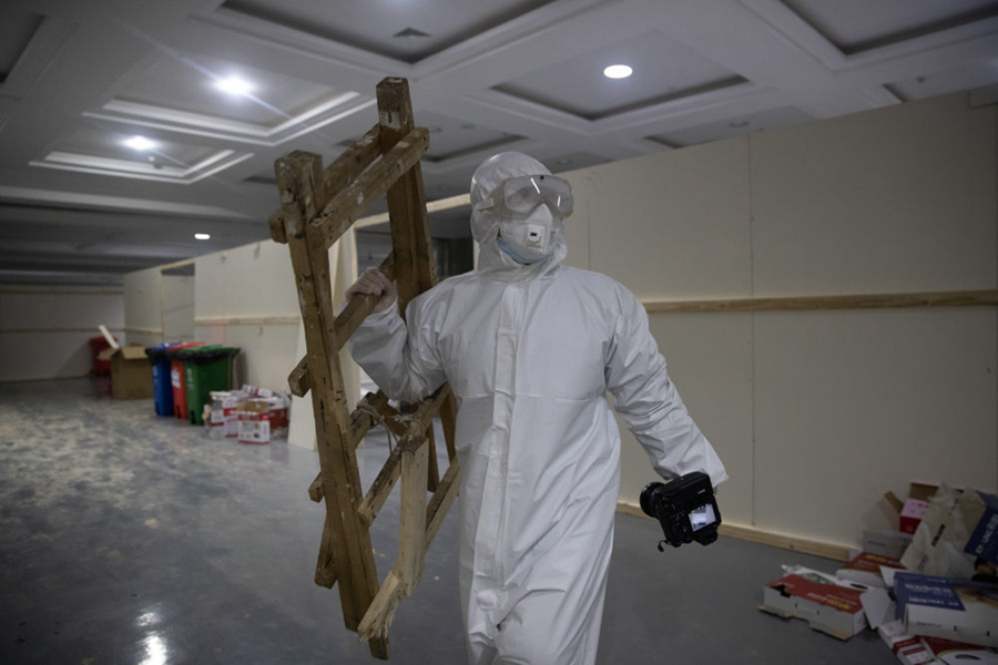 這些身影中還有被隔離的病人。江漢方艙醫(yī)院?jiǎn)⒂玫牡谝惶?,收治的首批病人里,有一個(gè)面目清秀的小伙子。入院躺下后,他打開(kāi)了一本《政治秩序的起源》,安靜地閱讀??谡终谧×怂谋砬椋珔s藏不住眼神里的平靜和專(zhuān)注??匆?jiàn)我舉起相機(jī),他輕輕擺了擺手,示意不用拍他,我猶豫片刻,還是執(zhí)意按下了快門(mén)。也許他并不明白,在有些喧囂的方艙醫(yī)院里,近乎靜止的他,是多么的令人震撼。