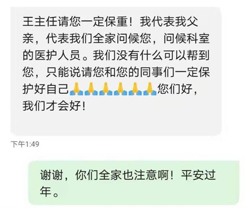 1月30日晚上10時(shí)許,武漢市中心醫(yī)院呼吸與危重癥醫(yī)學(xué)科副主任醫(yī)師王亮朝拖著疲憊的身子回到家里,意外收到了之前一位患者發(fā)過(guò)來(lái)的加油短信,簡(jiǎn)單的幾句話,讓他感覺(jué)十分溫暖,充滿力量。