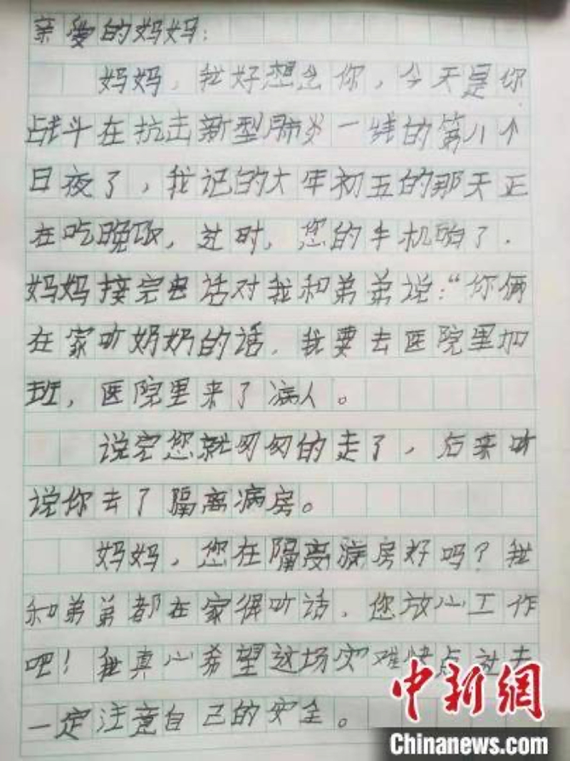 孩子在信中寫(xiě)道:“媽媽,我好想念你,今天是您戰(zhàn)斗在抗擊新型肺炎一線的第八個(gè)日夜了……媽媽,你是我崇拜的英雄?!?/p>
