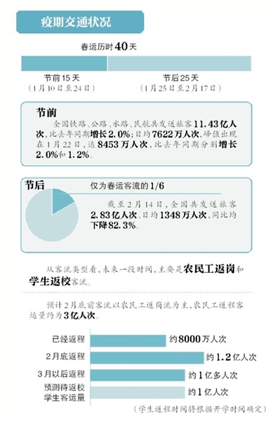 從客流類型看,未來一段時間,主要是農(nóng)民工返崗客流和學生返校客流,公務(wù)商務(wù)客流較少、旅游客流很少。預計2月底前客流以農(nóng)民工返崗流為主,2月底前將迎來學生返??土?。