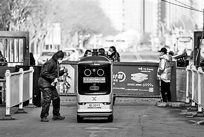 2月7日,京東物流的智能配送機器人進入呼和浩特市的一個封閉管理小區(qū),為居民配送快遞。新華社發(fā)