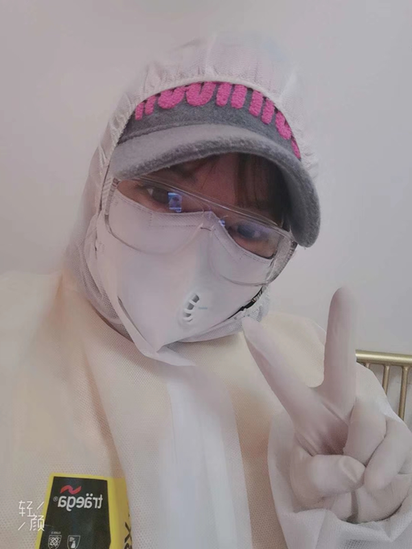 我出去心理壓力也很大,所以我回來進門之前,消毒工作從頭到腳,到鞋底都不放過。防護服那些在樓下脫下,拿個塑料袋裝起來丟到垃圾桶。站在門外噴消毒液,我老公拿著“槍”對著我噴,感覺我的呼吸道都被消毒了。