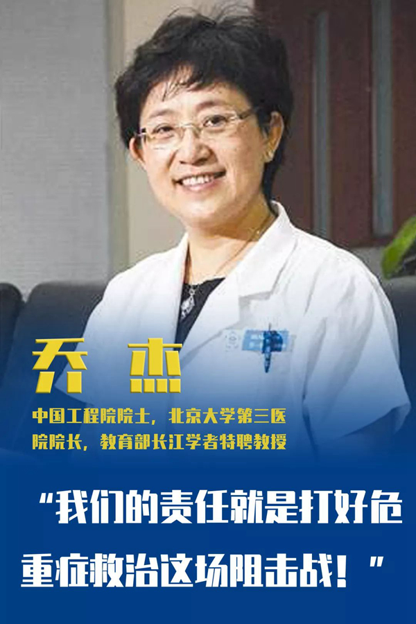 北京大學自創(chuàng)建以來,始終與國家和民族同呼吸共命運。此次新冠狀病毒感染疫情嚴重,情況危急。北大迅速派出附屬醫(yī)院的多批醫(yī)療隊馳援武漢。截止到2月13日,北大援鄂抗疫國家醫(yī)療隊已累計收治危重癥患者200余例,而作為領導組組長,喬杰也已在武漢駐守12天。她協(xié)同各院領導和專家組成員,迅速梳理工作流程,從管理體制建立、到病房改造,再到人員培訓,儀器設備調(diào)配,每一細節(jié)嚴格把關(guān)。她帶領團隊充分發(fā)揮北大醫(yī)學多學科合作優(yōu)勢,為提高新冠肺炎危重患者治愈率,降低病亡率履行著應盡的職責。