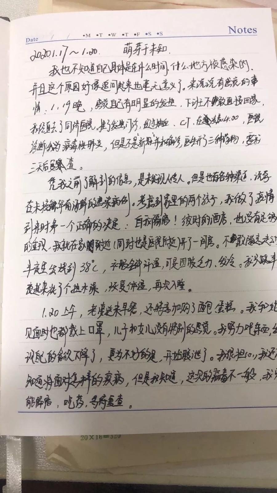 “1月20日—22日,第一次復(fù)查。食欲不振,發(fā)熱一陣一陣的,身體發(fā)虛,四肢無(wú)力,檢測(cè)結(jié)果為疑似病例,心中仍然忐忑,不知道自己的病情將走向何方?!?/p>