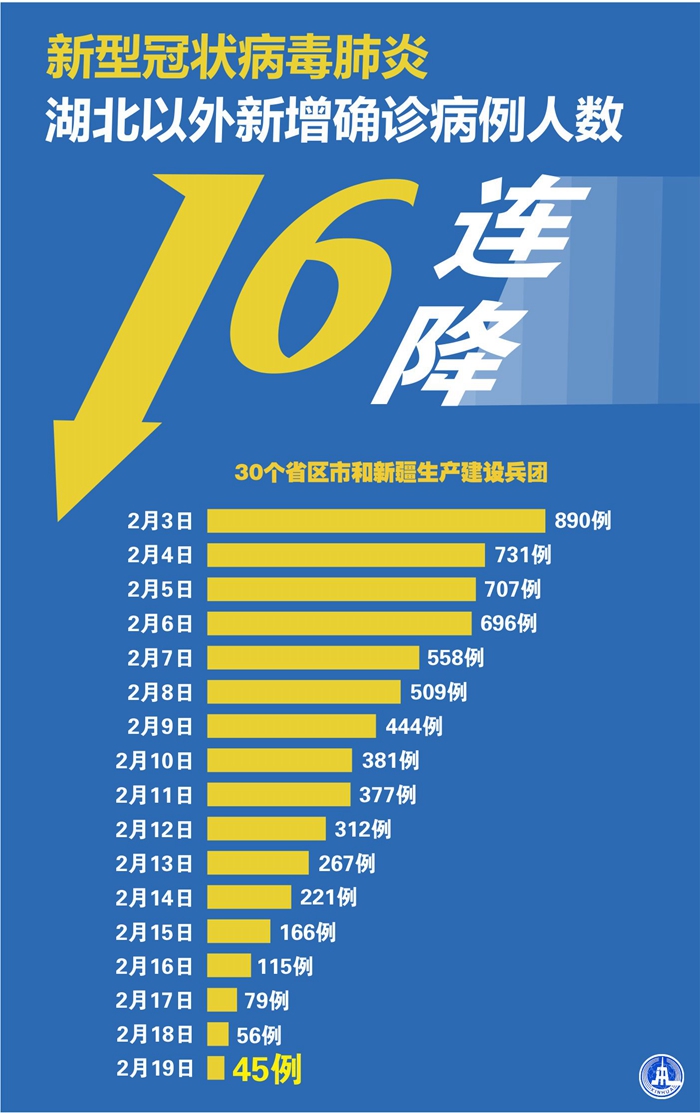 截至2月19日24時,據(jù)31個省(自治區(qū)、直轄市)和新疆生產(chǎn)建設(shè)兵團(tuán)報告,現(xiàn)有確診病例56303例(其中重癥病例11864例),累計治愈出院病例16155例,累計死亡病例2118例,累計報告確診病例74576例(江西、河南、云南省各核減1例),現(xiàn)有疑似病例4922例。累計追蹤到密切接觸者589163人,尚在醫(yī)學(xué)觀察的密切接觸者126363人。