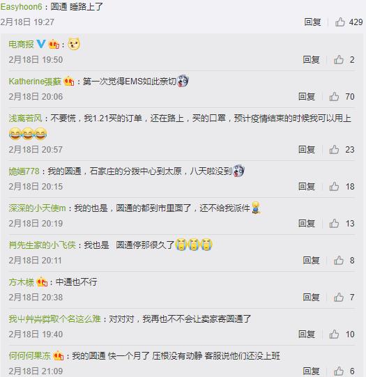 網(wǎng)友“滿杯甜酒椰”發(fā)布微博稱,“我十天沒動(dòng)的韻達(dá)是不是可以更新一下物流惹”;網(wǎng)友“啵霸兔兔果茶”說,“圓通快遞怕是消失了,送個(gè)東西幾天不動(dòng)一下”;網(wǎng)友“啊啊啊喵在等待”則調(diào)侃,“等中通快遞把我的口罩寄到了,疫情也快結(jié)束了吧”。