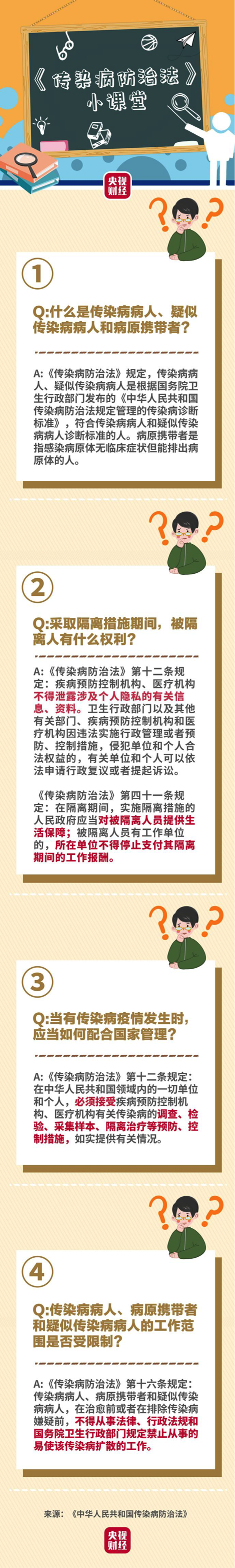 隔離期間不工作,你還能拿到工資嗎?配合疾病預(yù)防控制機(jī)構(gòu)、醫(yī)療機(jī)構(gòu)調(diào)查,你的個人信息會被泄露嗎?在治愈前或者在排除傳染病嫌疑前,你的工作范圍受限嗎?新冠肺炎疫情當(dāng)下,我們該如何用法律保護(hù)自己?央視財(cái)經(jīng)今天推出《傳染病防治法》小課堂第二期,戳一圖↓↓