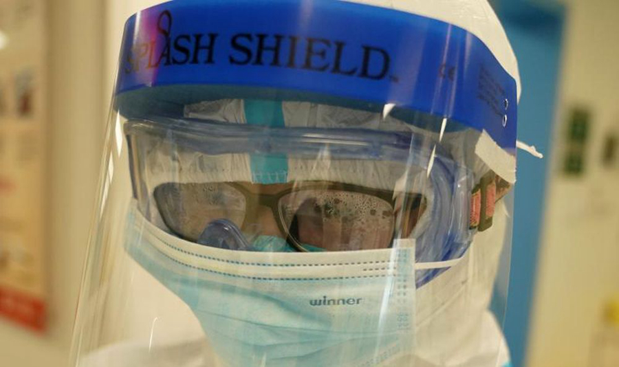 “全副武裝”的護(hù)士漆思河眼鏡里產(chǎn)生了大量水汽。新華社記者王毓國(guó) 攝