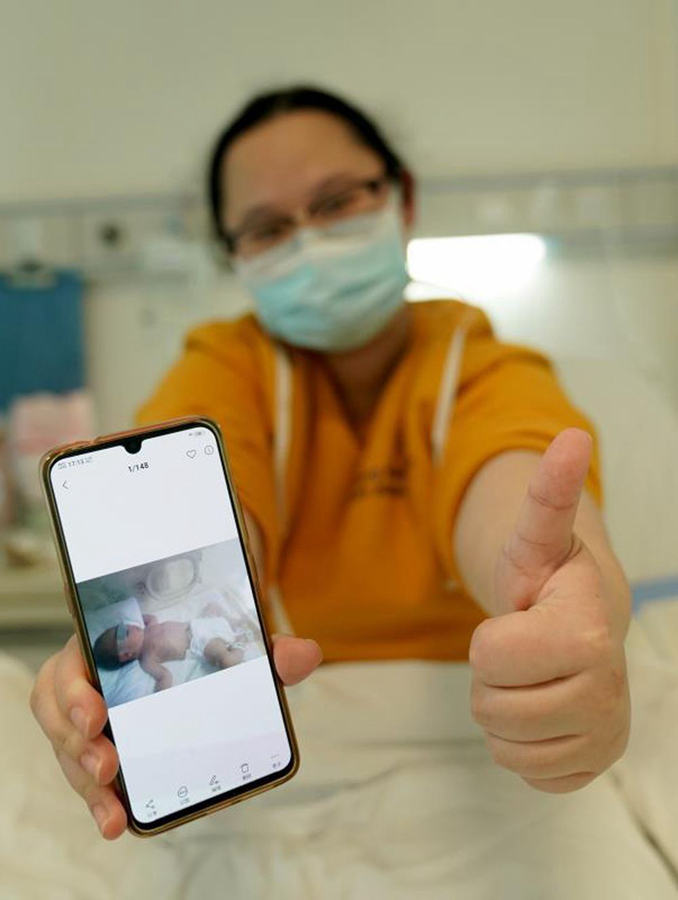 2月18日,楊女士展示手機(jī)中自己兒子的照片。在武漢華中科技大學(xué)同濟(jì)醫(yī)院中法新城院區(qū)新冠肺炎重癥病區(qū)住院的楊女士是武漢人,在身患新冠肺炎后剖腹產(chǎn)下一名男嬰。嬰兒目前在醫(yī)院進(jìn)行隔離觀察,但各項(xiàng)指標(biāo)均正常。當(dāng)楊女士知道孩子的情況后,懸著的心終于放下。在醫(yī)護(hù)人員的努力下,她的病情也有了好轉(zhuǎn)。新華社記者王毓國(guó) 攝